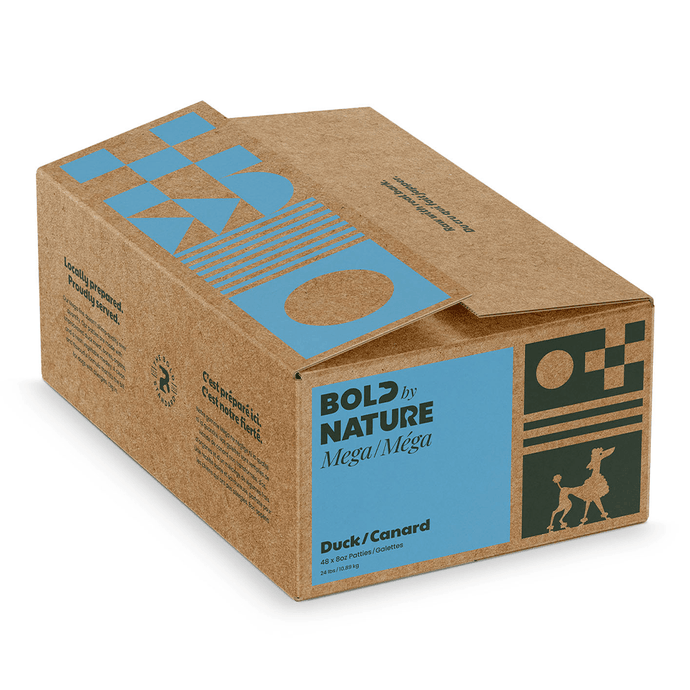 Our Bold By Nature Mega Duck patties are full of ground duck meat, ground bone, organ meats and fresh veggies. It fits the bill for dogs with allergies.