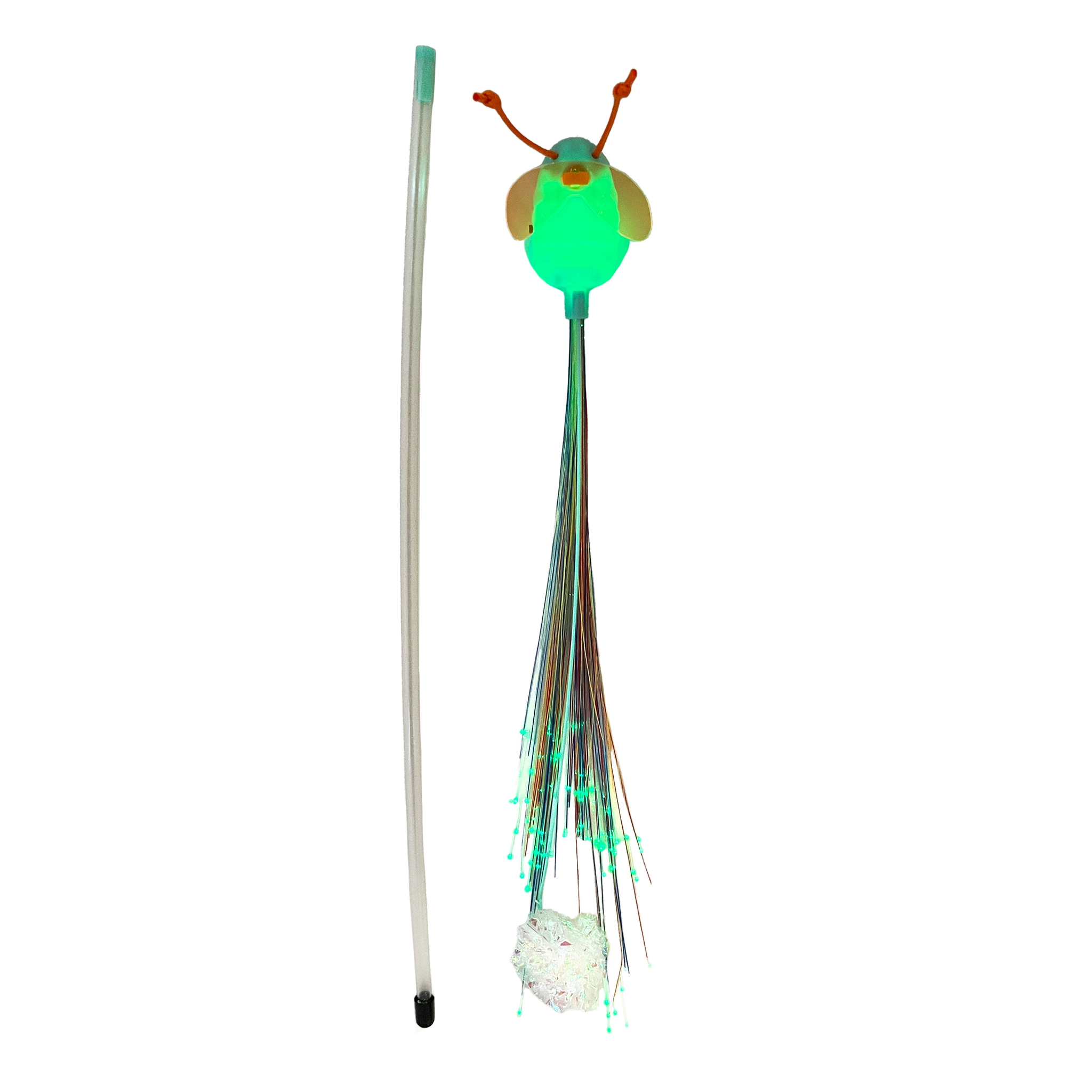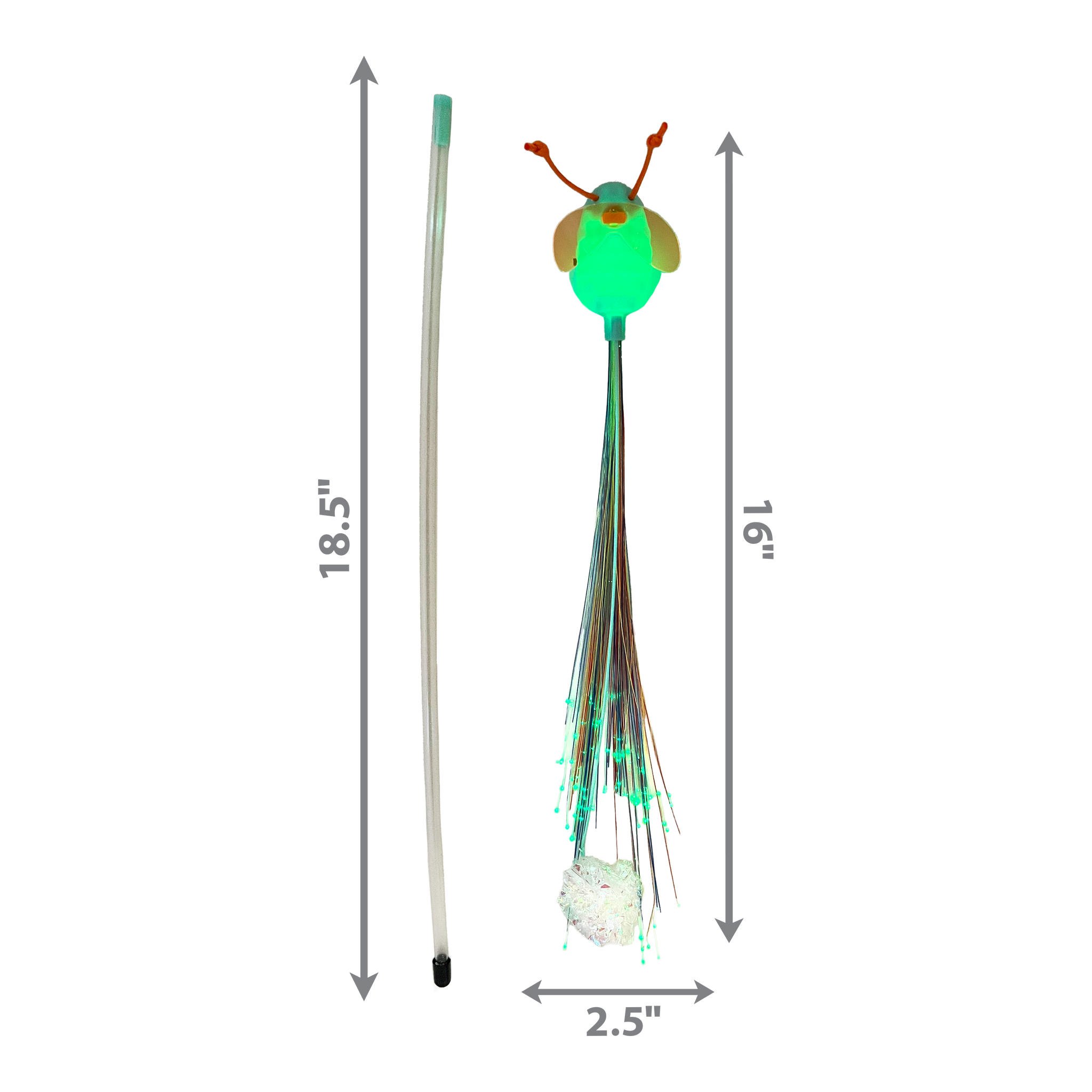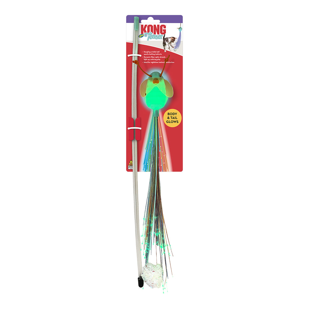 KONG Glow Firefly Teaser’s long, swaying strands light up to spark hunting instincts—especially when enjoyed in the dark. Dangling crinkle ball gives cats a batting target, while wings and antennae add extra allure. A long wand helps extend the fun and playful action. Batteries included.