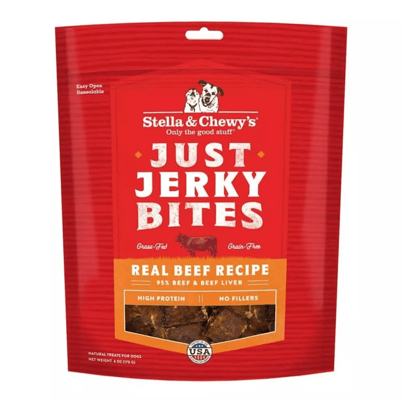 Treat your picky pup to major flavor with Stella & Chewy's Just Jerky Bites Real Beef Recipe Grain-Free Dog Treats. These tender and tasty treats are made with a single-source protein and limited ingredients to help satisfy even the most sensitive stomach. Each bite-size treat is packed with 95 percent meat including beef and nutrient-rich organs. They’re free from fillers including grains, legumes, wheat, corn and soy and contain no artificial colors, flavors or preservatives. Paw-fect for dogs of all ages and sizes.