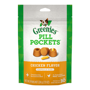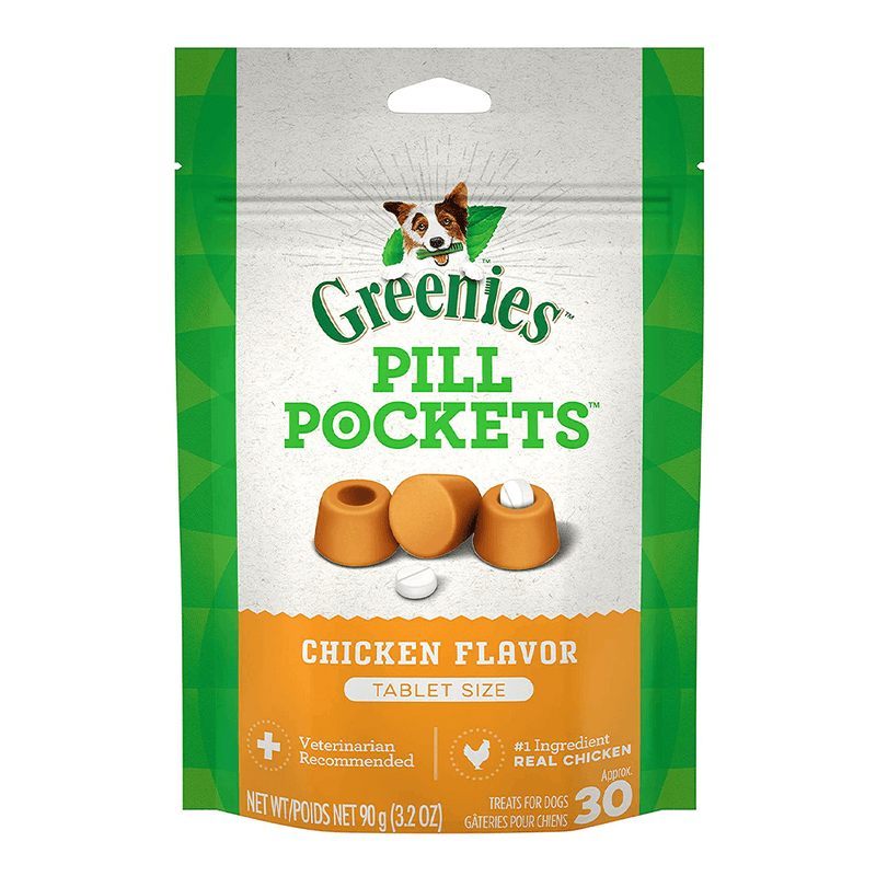 Pets are smart about avoiding their meds, but you're smarter. Designed and recommended by vets, GREENIES™ PILL POCKETS™ Treats for Dogs make it easy to give your dog medicine. Don't hide medicine in human foods, such as peanut butter or cheese. Give a healthy, low-calorie dog treat instead. GREENIES™ PILL POCKETS™ Treats take the stress and mess out of administering capsules or liquid medication to your dog. Our easy-to-use pouches mask the smell and taste of medicine and deliver a delicious chicken flavor your dog will love.