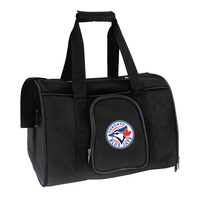 The Toronto Blue Jays Pet Carrier Premium 16" bag in Navy is a stylish, convenient and safe way to travel with your pet. Made of lightweight polyester this Pet Carrier fits comfortably under most airline seats while affording your pet ample, non-compacted space. Plastic mesh panels on three sides provide excellent ventilation and pet visibility. Has a removable washable fleece floor panel for comfort and structural stability. Carrier is easy to lift and carry, with a sturdy padded top handle, adjustable/detachable shoulder strap, and a side sleeve that enables the carrier to slide onto the handle of your roller suitcase. for easy transport within the airport. Also includes a side zipper pocket for small items and can accommodation pets up to 16lbs.