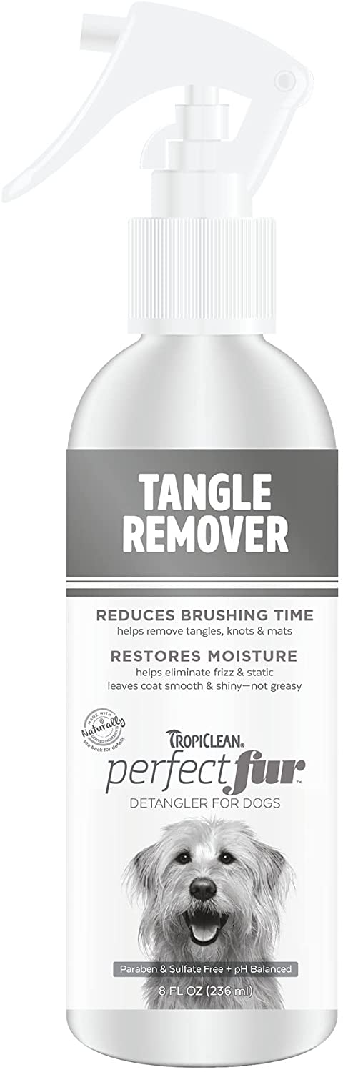 TropiClean Tangle Remover repels dirt, adds shine and makes brushing a breeze. This ready to use, no-rinse formula quickly penetrates mats and tangles to gently remove knots, reducing brushing time by up to 50%, allowing more time for snuggles. Our new formula delivers a revolutionary way to remove mats, tangles, undercoat, and loose hair from your pet’s coat.  Use the Tangle Remover to cut your brushing time in half, while reviving damaged coats, restoring elasticity and leaving hair with a healthy shine. No Rinse. Brushing Made Easy.
