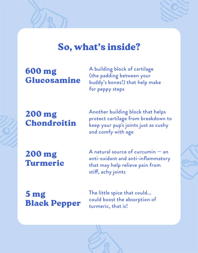 Let’s keep the pep in your pup’s step! An advanced (and extra tasty!) formula packed with natural anti-inflammatories to help your pup move more comfortably and confidently – without the artificial flavors or preservatives.