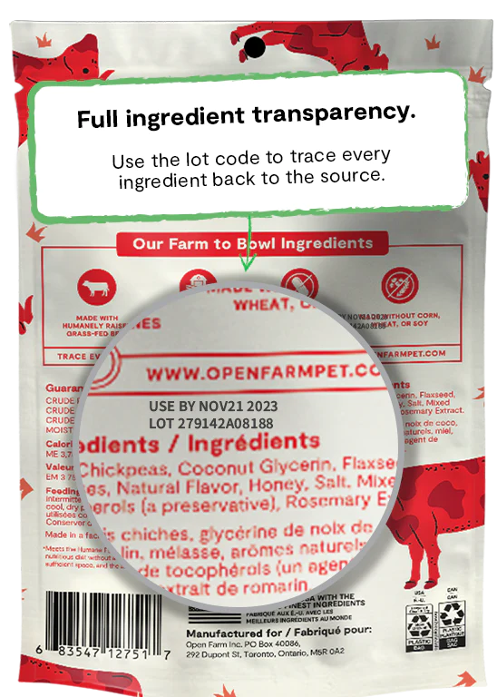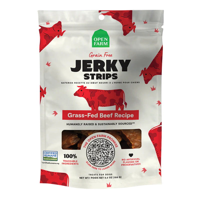 Open Farm grass-fed beef jerky strips feature certified humane beef to deliver an incredible taste your dog will crave! As with all Open Farm products, our ethically sourced, farm to bowl ingredients are 100% traceable. Our jerky strips are crafted in a way that respects animal welfare and our planet. Approximately 7-8 strips per bag.