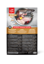 Ingredients: Fresh chicken (23%), raw turkey (10%), fresh chicken giblets (liver, heart) (8%), raw whole herring (6%), raw whole hake (5%), fresh eggs (5%), dehydrated chicken (4%), dehydrated turkey (4%), dehydrated mackerel (4%), dehydrated sardine (4%), dehydrated herring (4%), chicken fat (4%), whole red lentils, whole peas, whole green lentils, whole chickpeas, lentil fibre, whole pinto beans, whole navy beans, raw turkey liver (2%), pollock oil (2%), pea starch, dried kelp, fresh whole pumpkin, fresh whole butternut squash, fresh whole zucchini, fresh whole carrots, fresh whole apples, fresh whole pears, dried chicory root, fresh kale, fresh spinach, fresh beet greens, fresh turnip greens, whole cranberries, whole blueberries, whole saskatoon berries, turmeric, milk thistle, burdock root, lavender, marshmallow root, rosehips.