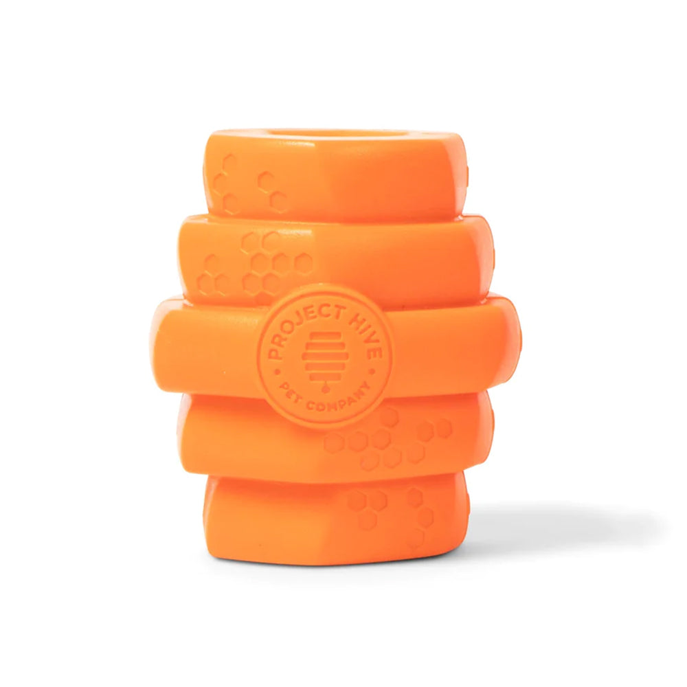 Our mango-scented Hive Chew Toy is a super engaging toy for larger dogs. Made in the USA, its erratic bounce keeps dogs happily occupied during fetch. Dogs love to gnaw on the Hive Chew Toy’s unique knobby ends, promoting healthy teeth and gums. It's also perfect as a treat dispenser—any treat. We recommend our Hive Chew Stick Treats, uniquely designed to wedge snugly inside the cavity, creating an even more enriching experience for your dog.
