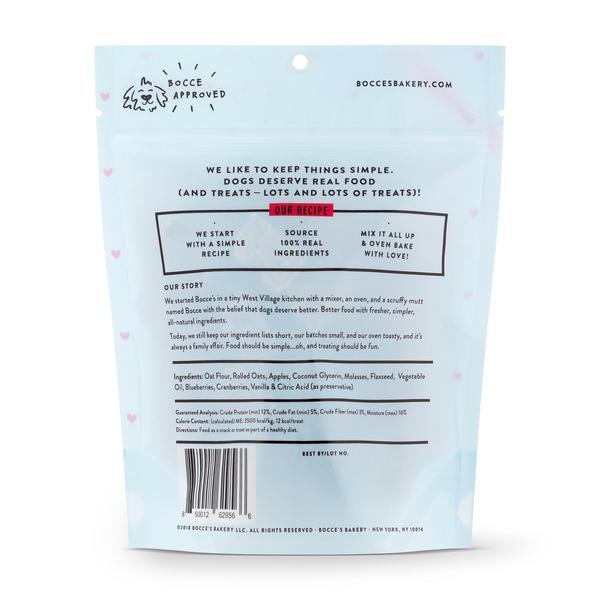 Oat Flour, Rolled Oats, Apples, Coconut Glycerin, Molasses, Flaxseed, Canola Oil, Blueberries, Cranberries, Vanilla, and Citric Acid