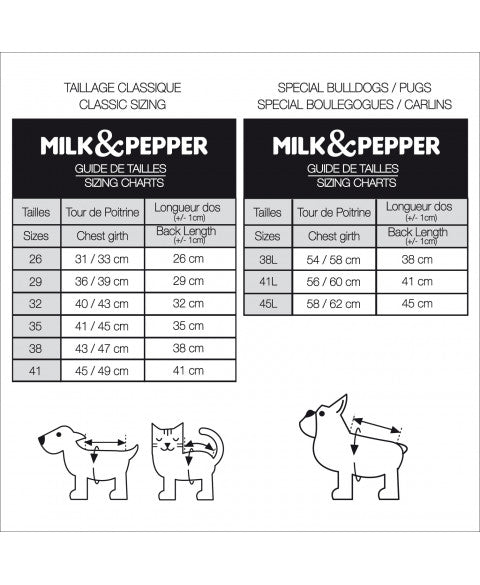 • Sizes L - Specially adapted to the morphologies of bulldogs and Pugs, with a wider body circumference