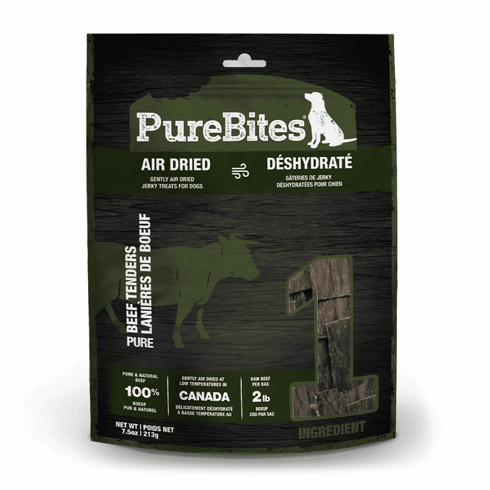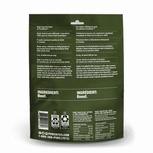 At PureBites, we’re always asking pet parents to “Go ahead, look at our ingredients”. PureBites gently air dried beef jerky dog treats are made with only 1 simple high-quality ingredient you can read, pronounce, and trust: 100% pure beef. Nothing else. No artificial colors, fillers, sweeteners, or glycerin. Proudly sourced and made fresh & pure in Canada using a delicate air drying process at low temperatures which helps preserve fresh RAW whole food, locking in the taste dogs crave and superior nutrition that pet parents love.