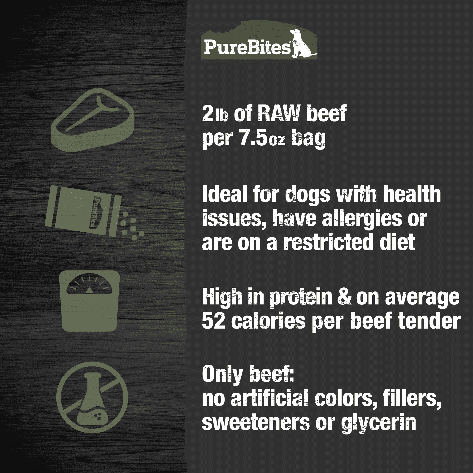 • Dogs love the taste of PureBites! 100% natural, pure, high in protein, only 52 calories per beef tender, and nothing added like artificial colors, fillers, sweeteners, or glycerin