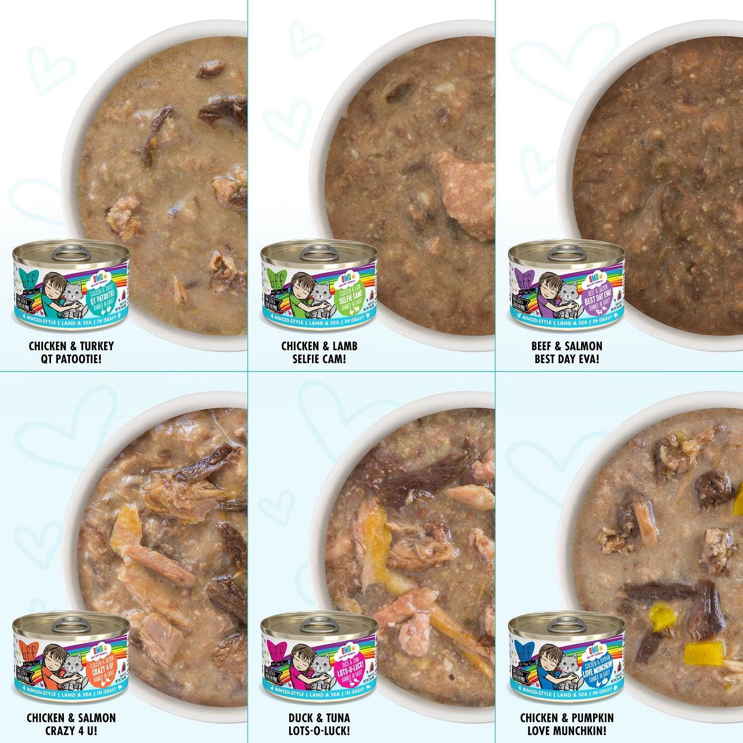• Grain-free wet food variety pack with real meat including beef, salmon, tuna, chicken, turkey, lamb and more.