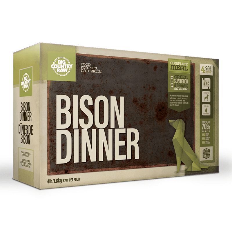 Big Country Raw Bison Dinner is a lean red meat choice with less cholesterol and fewer calories than beef.  Excellent choice for dogs with food allergies.
