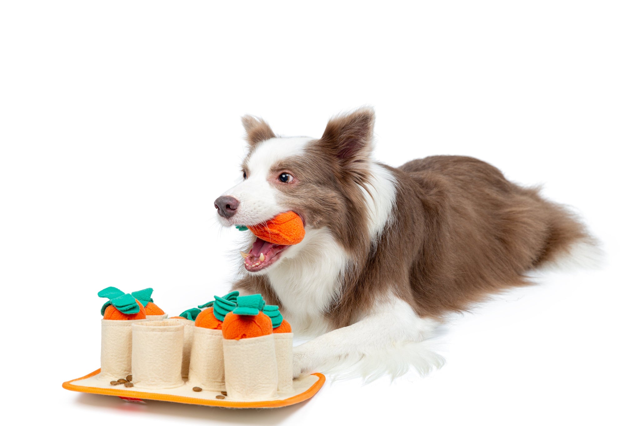 Show your pup how what it's like to eat in the wild with Injoya's "Carrot Patch" Snuffle Feeding Toy. This toy for dogs helps to slow your dog's food consumption while stimulating their minds. Made of non-toxic and durable materials and makes meals fun. Machine washable and perfect for small to large dog breeds.