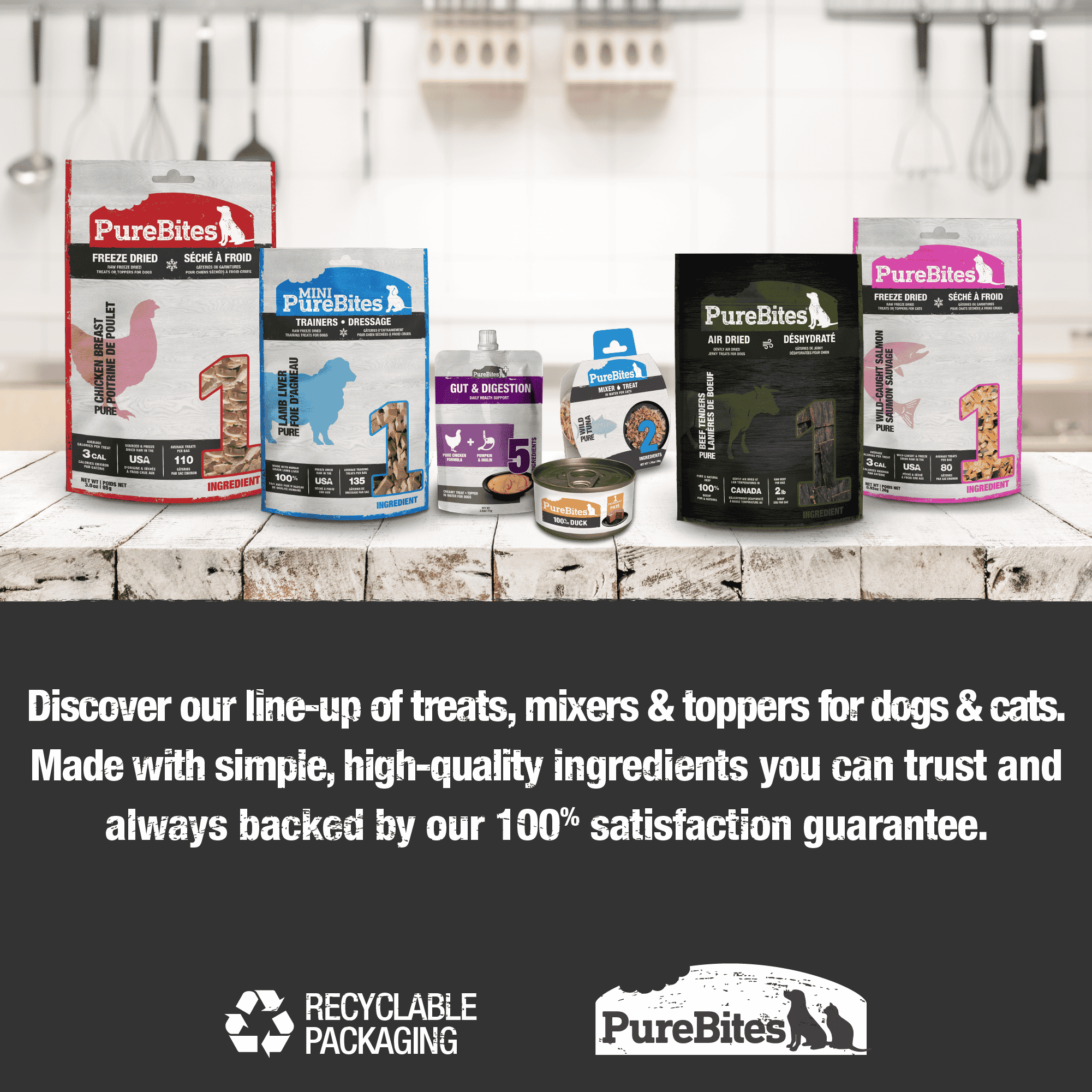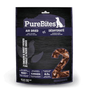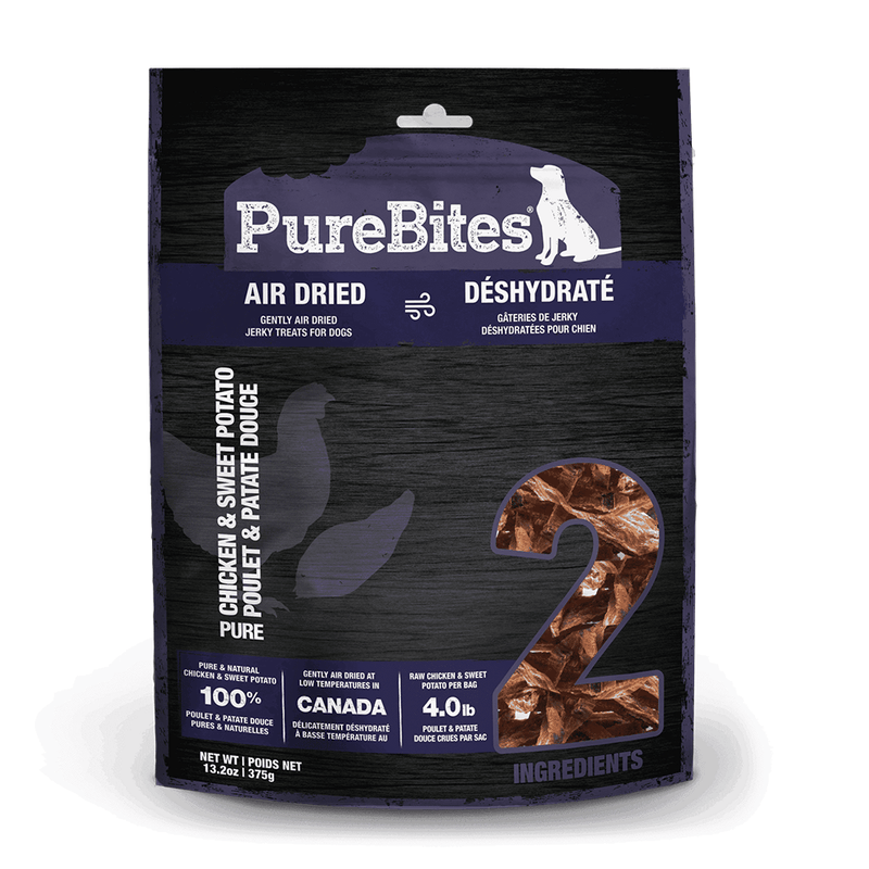 Go ahead, turn the bag around and look at our ingredients. PureBites Chicken & Sweet Potato air dried dog treats are made with only 2 ingredients; 100% Pure & Natural Chicken Breast & Sweet Potato. Dogs love the taste of PureBites because our treats are gently air dried to lock in the aroma, texture and freshness they crave. Dog parents love PureBites because our treats are 100% pure and rich in nutrients for a happy & healthy life.