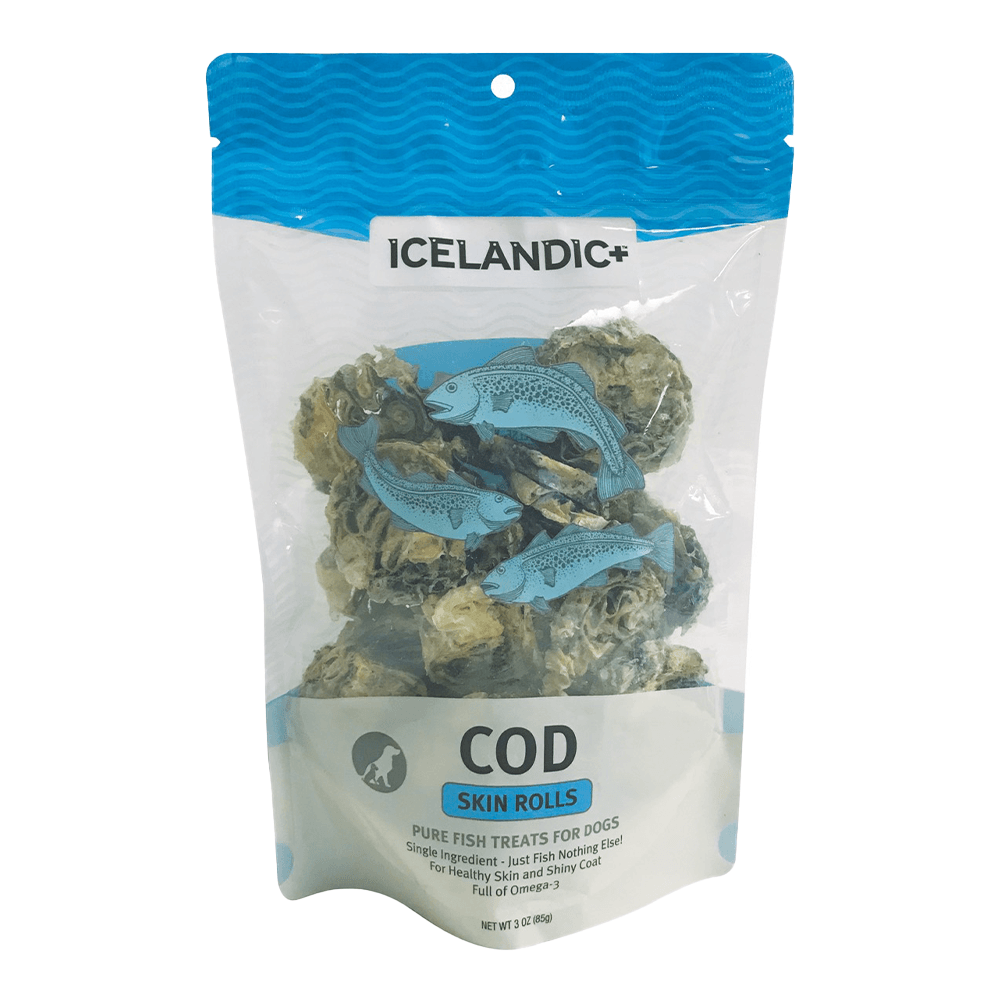 Our 100% natural and edible Icelandic Cod Fish Skin Rolls are single ingredient and contain no additives, preservatives or supplements. They come only from the pure icy waters of Iceland and are line-caught daily and processed immediately. Not only are they delicious for your dog, they reduce tartar and plaque build-up for healthier gums and teeth. They are also a great natural source of Omega-3 fatty acids, promoting healthy skin and coat for your pet. With just one ingredient, these tasty and healthy treats are perfect for dogs with protein sensitivities. Our natural and edible fish products offer peace of mind, as they are cleaned and air-dried within FDA, USDA, EU, and MAST standards and regulations. Because Iceland almost never gets warm, our fish always remain cold after being caught. As a result, they have less smell than other fish treats in the market.