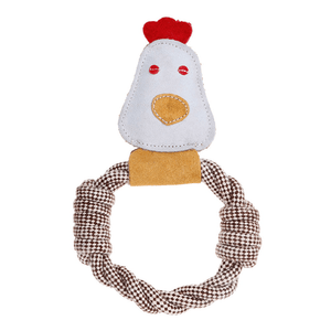 Country Tails Calico Chicken Rope Dog Toy is made using genuine suede and stuffed with natural jute. Featuring double basting stitching for extra strength. Jute is a sustainable, strong, vegetable fiber which is compostable and used for the stuffing. Each toy is colored using natural, sustainable dyes to make them safe for your dog to play. The rope is natural wool and adds great fun to playtime.