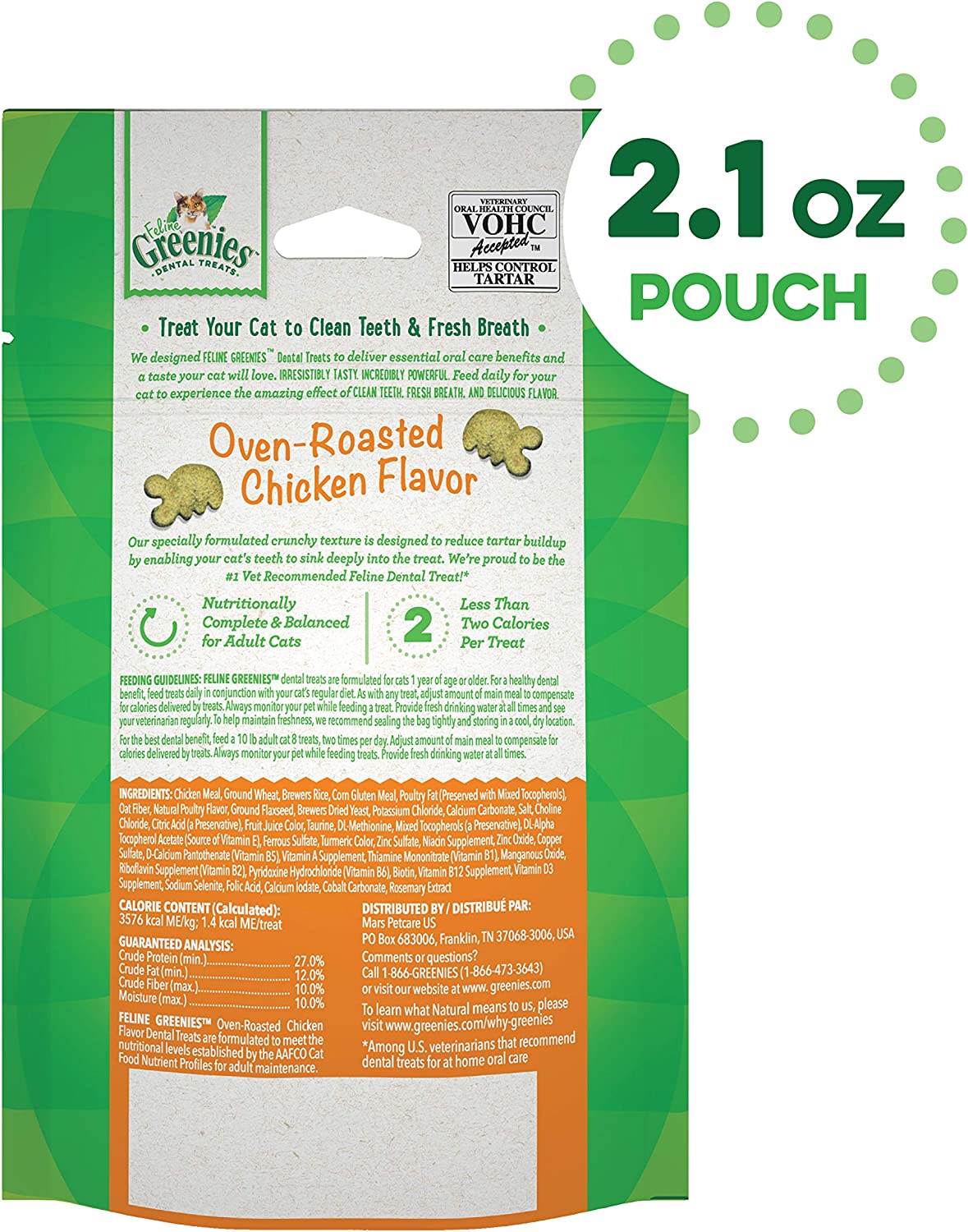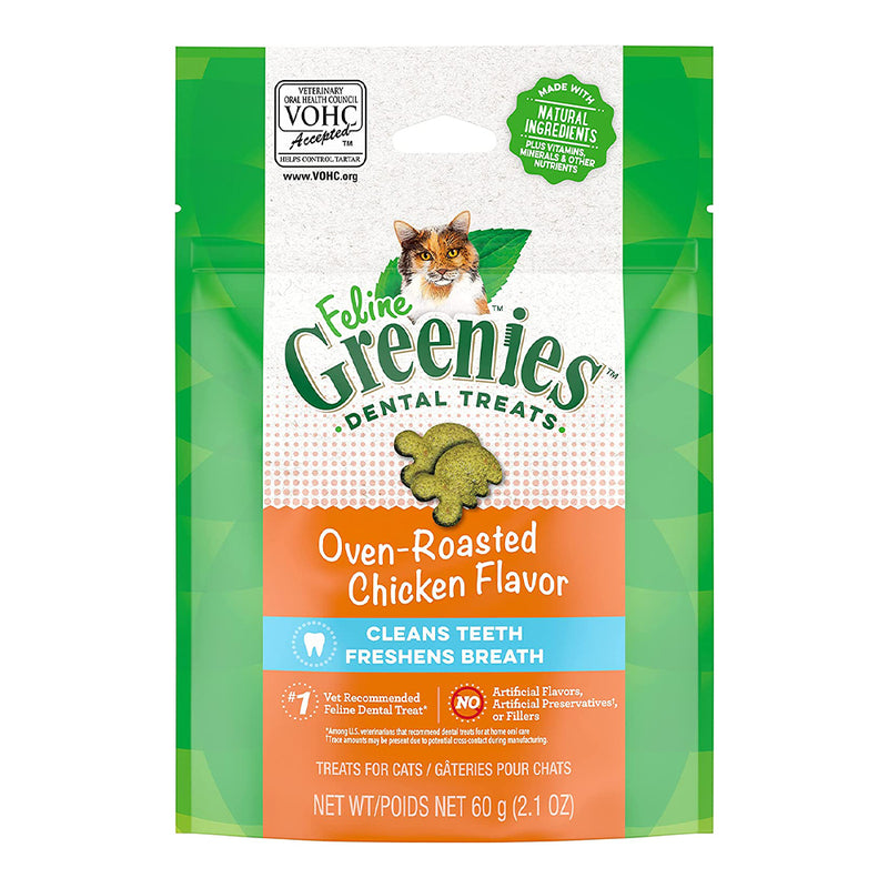 • This convenient pouch contains 2.1 oz. of FELINE GREENIES Crunchy Dental Treats in Oven Roasted Chicken Flavor