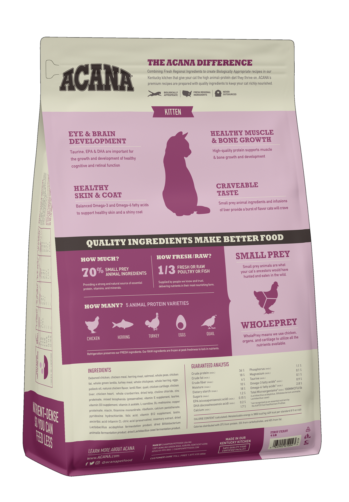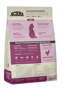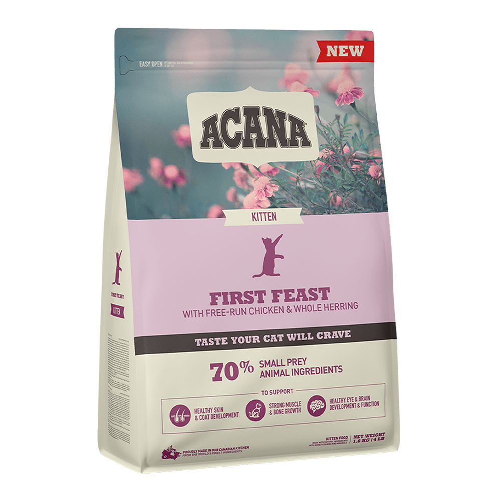 Our ACANA® cat food goes beyond the 1st ingredient, thoughtfully crafting our recipes from start to finish. Feed your little wildcat a diet packed with quality animal ingredients. Crafted to provide everything your kitten needs for peak growth and development, ACANA First Feast recipe is brimming with 70%* quality animal ingredients like free-run chicken** and whole herring, delivered fresh or raw+ in their most nourishing form. Artificial colours, flavours or preservatives are never added in our kitchen.
