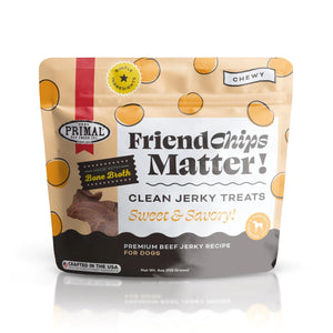 These sweet & savory jerky chips are crafted with thoughtfully-sourced beef, organic sweet potato, and wholesome Primal Bone Broth for a chewy, irresistible treat your pup can enjoy over & over again.