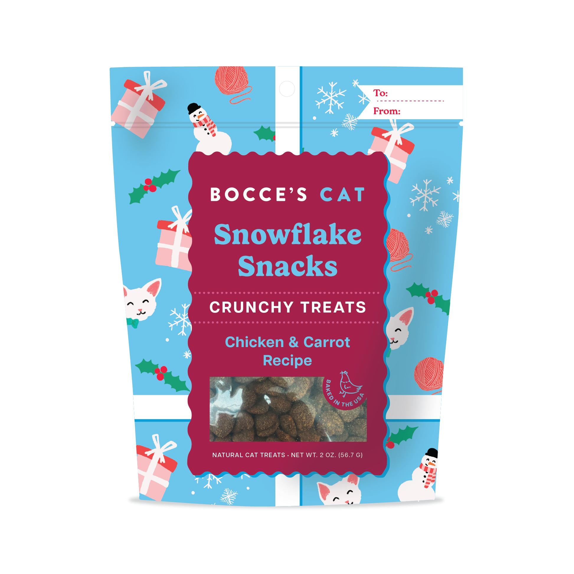 Keep your cat in the holiday spirit (and out of the snow) with our Snowflake Snacks crunchy treats. Our recipe is baked with chicken and carrots perfect for those cozy winter nights!