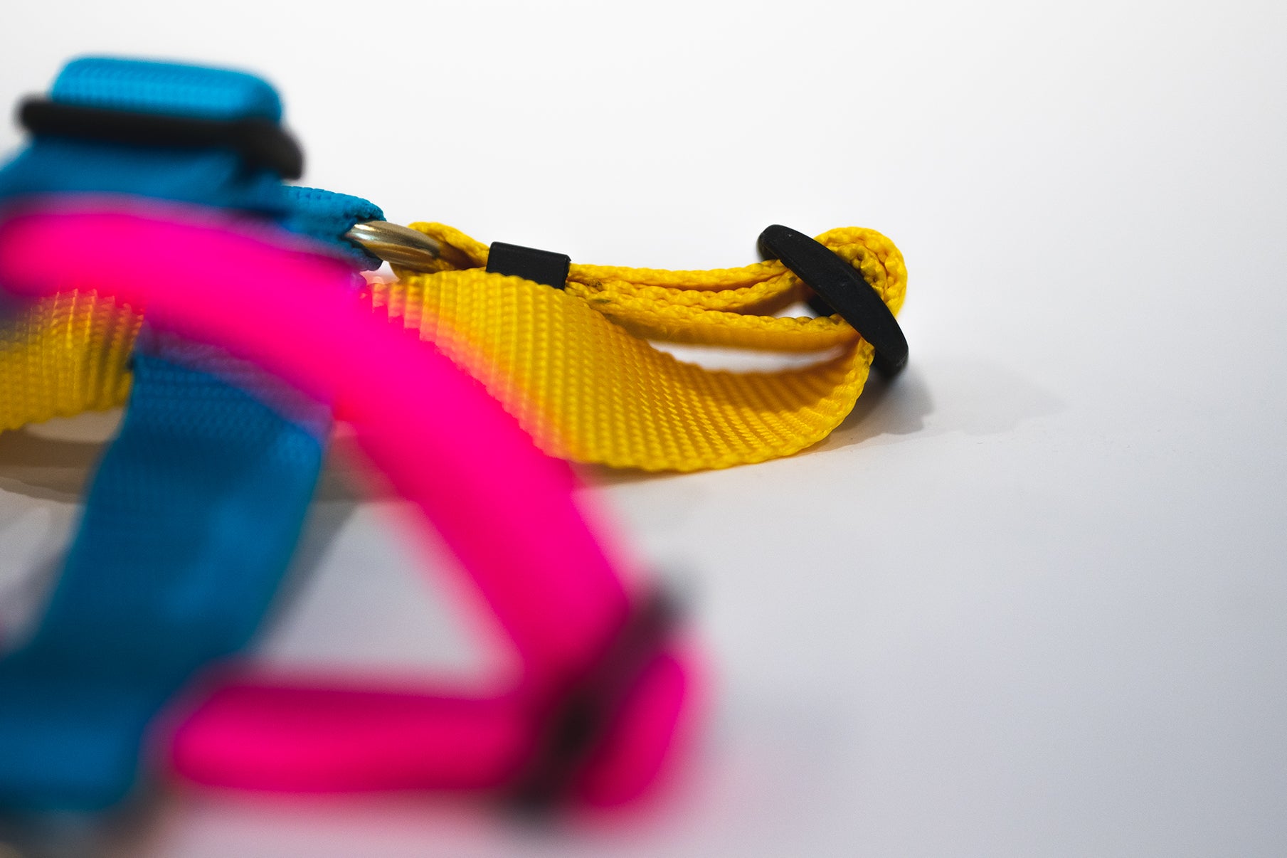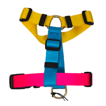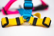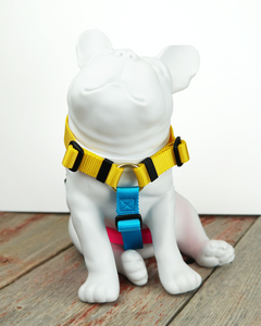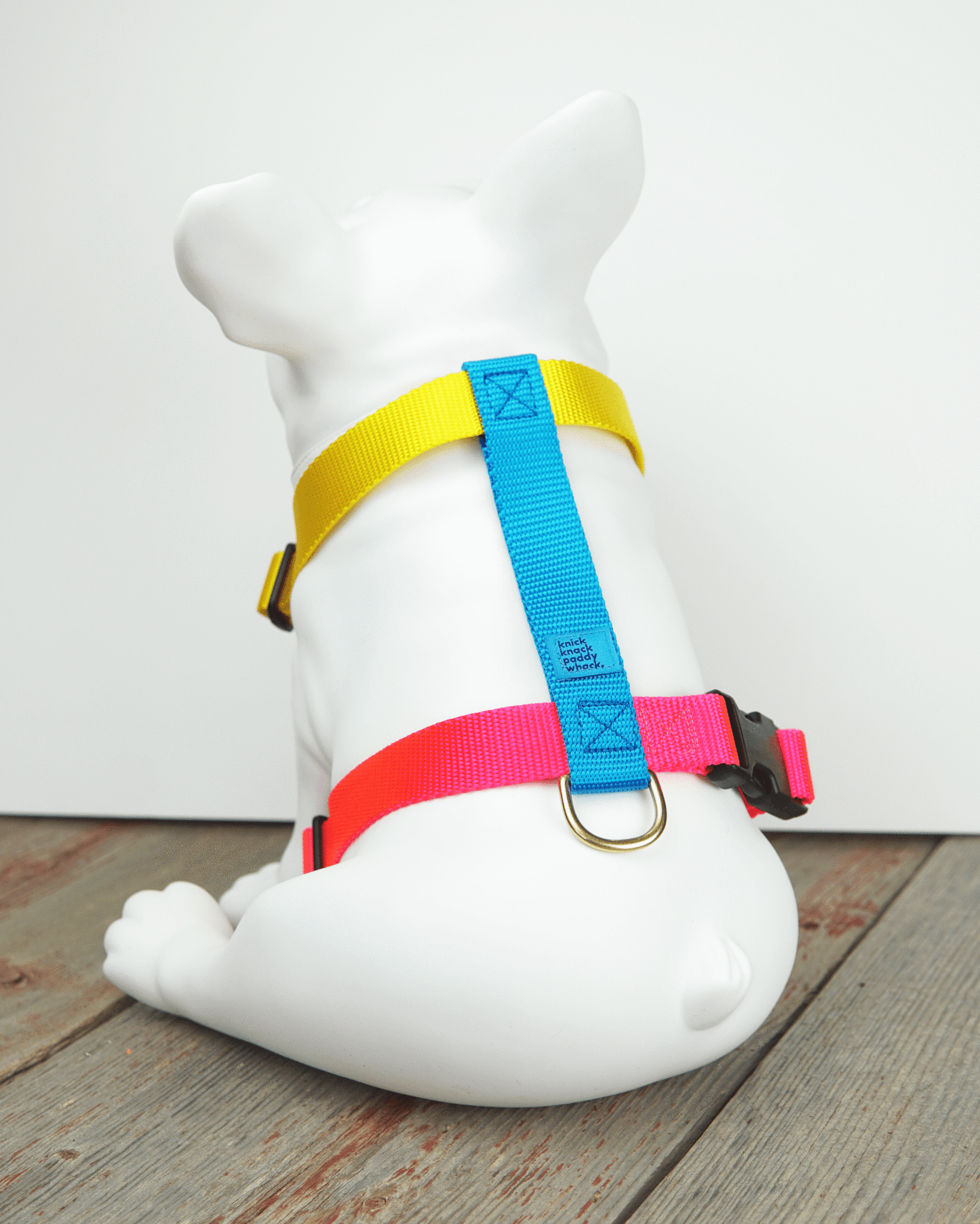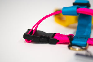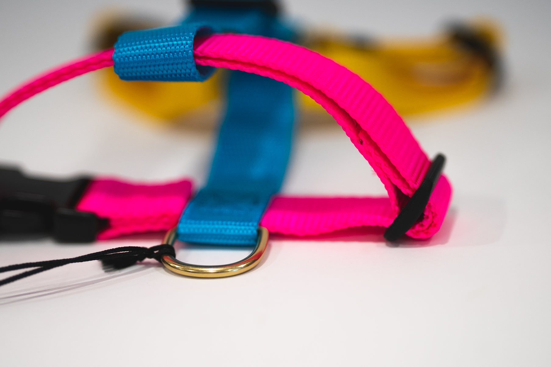 Yellow, Blue & Neon Pink. Designed to distribute pressure away from the shoulders our H Harness provides support in all the right places. The versatile rear and front clip options make it the ideal harness for tough pullers to casual strollers.