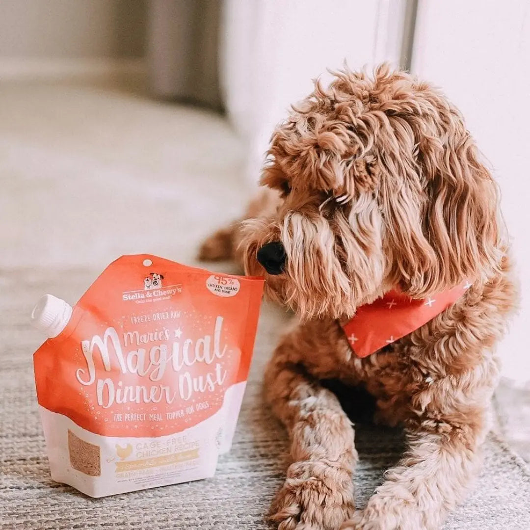 Simply sprinkle 2 tablespoons of Marie’s Magical Dinner Dust for every one cup of your dog’s food. Adjust according to your dog’s weight, activity level and breed. This product intended for intermittent or supplemental feeding only.