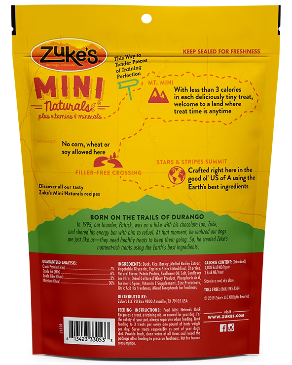 Training is one of the biggest adventures you and your dog will set off on together. And with the right treat, you can keep each and every moment healthy and deliciously fun. At less than 3 calories per treat, Zuke's Mini Naturals are the perfect little size to fit every trainable moment that pops up. These tasty, tender morsels are specially crafted in the USA using the Earth’s best ingredients — like protein-rich meat, wholefood berries, savory herbs and NO corn, wheat or soy.