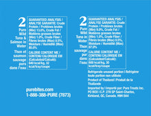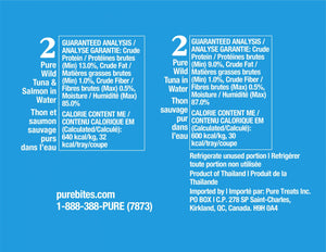 Ingredients: 100% Pure Water, Wild-caught Skipjack Tuna, Wild-caught Alaskan Salmon.