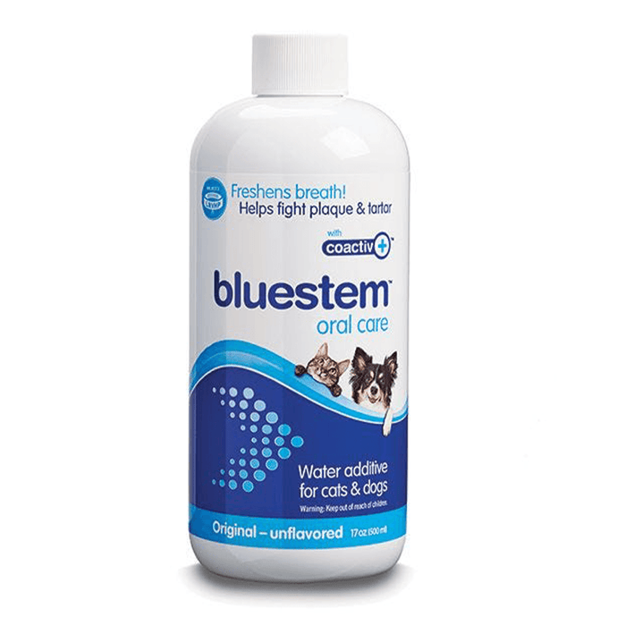 bluestem™ Water Additive comes in three different flavors and is one of the easiest products to use. Just add 2 capfuls to 2.5 cups of your pet’s drinking water and you’re done. In an independent, Good Clinical Practice Efficacy study, dogs were given bluestem™ water additive in their daily drinking water, and by 84 days showed a 25.4% reduction in tartar – without even brushing!