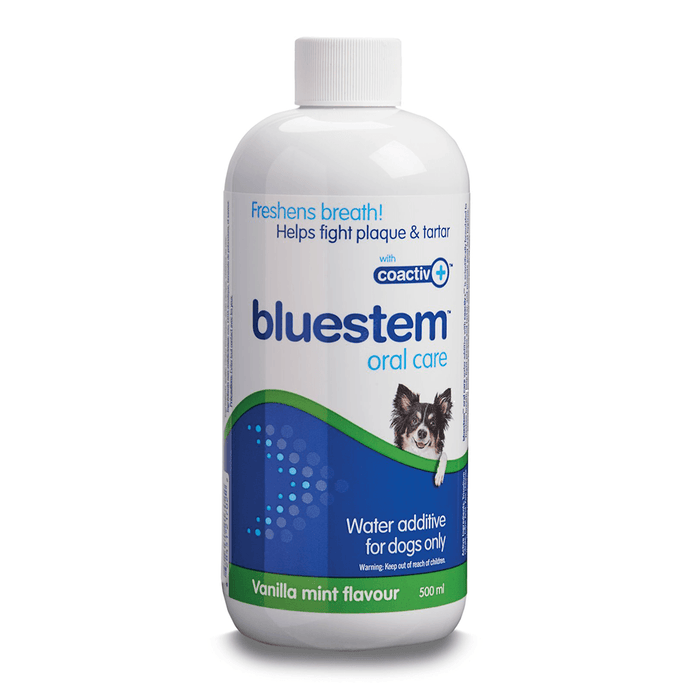 bluestem™ Water Additive comes in three different flavors and is one of the easiest products to use. Just add 2 capfuls to 2.5 cups of your pet’s drinking water and you’re done. In an independent, Good Clinical Practice Efficacy study, dogs were given bluestem™ water additive in their daily drinking water, and by 84 days showed a 25.4% reduction in tartar – without even brushing!