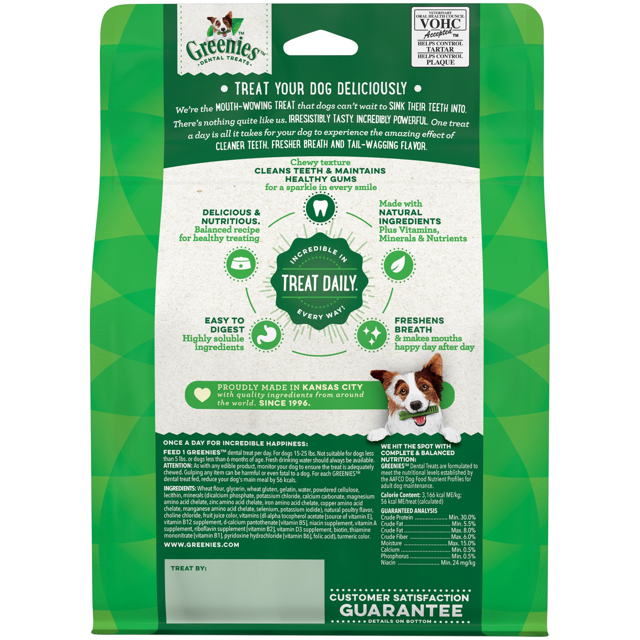 One GREENIES™ Original Dental Treat a day is all it takes for clean teeth, fresh breath and a happy dog. Your dog can't wait to sink their teeth into these delicious, original-flavor dental dog chews because they feature a delightfully chewy texture that fights plaque and tartar. Irresistibly tasty and incredibly powerful, GREENIES™ Treats for Dogs are recommended by veterinarians for at-home oral care. Best of all, these natural dog treats are made with highly soluble ingredients that are easy to digest. Give your dog the mouth-wowing treat that helps promote oral health with GREENIES™ Dog Treats.