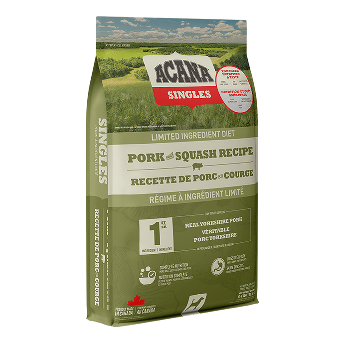 Our Best Recipe Ever! ACANA Singles Pork with Squash Recipe is now loaded with more meat no peas for enhanced nutrition and taste your dog will love! Our Limited Ingredient recipe includes 60% real Yorkshire pork in WholePrey ratios of meat, organs, and cartilage, complemented with whole, delicious squash, providing your dog with the protein, nutrients, and fibre they need in order to stay happy, healthy, and strong.