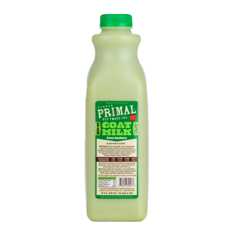 A nutrient-rich hydration option plus organic kale and quinoa—ingredients that are known to support energy and vitality! Suitable for dogs or cats. Green Goodness Raw Goat Milk is available in 32oz resealable bottles.