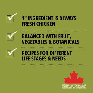 Ingredients: Fresh chicken (18%), chicken meal (18%), whole red lentils, whole green peas, fresh chicken giblets (liver, heart) (7%), chicken fat (7%), turkey meal (4%), eggs (4%), raw flounder (4%), herring meal (4%), fish oil (3%), whole green lentils, whole chickpeas, whole yellow peas, pea fiber, pea starch, raw turkey livers (1%), salt, dried kelp, fresh whole pumpkin, fresh whole butternut squash, fresh whole carrots, fresh whole apples, fresh whole pears, fresh whole zucchini, dried chicory root, fresh kale, fresh spinach, fresh turnip greens, fresh beet greens, fresh whole cranberries, fresh whole blueberries, fresh whole saskatoon berries, turmeric, milk thistle, burdock root, lavender, marshmallow root, rosehips