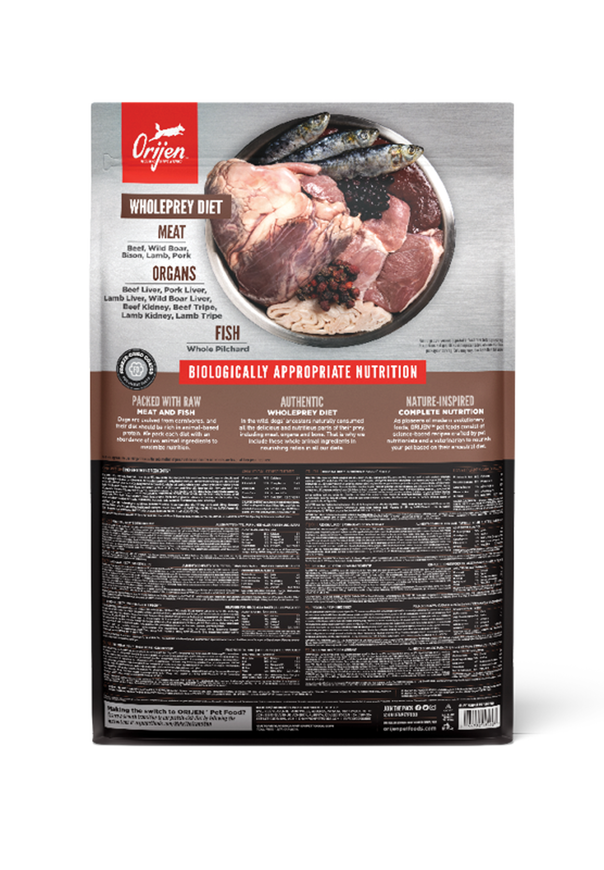 Help your dog thrive with the power of protein-rich recipes that provide peak nourishment. Dogs are ancestral carnivores, so they need a Biologically Appropriate diet rich and varied in whole animal ingredients. ORIJEN® Regional Red diet is packed with 85%1 quality animal ingredients like raw2 beef, wild boar, bison, lamb and pork. Packed with WholePrey animal ingredients like organs and bone, ORIJEN food is made with the most nutrient-dense, succulent parts of the prey to deliver the nutrition dogs need. The result is a diet for your canine companion that is beyond comparison.
