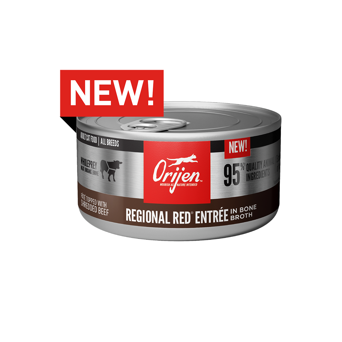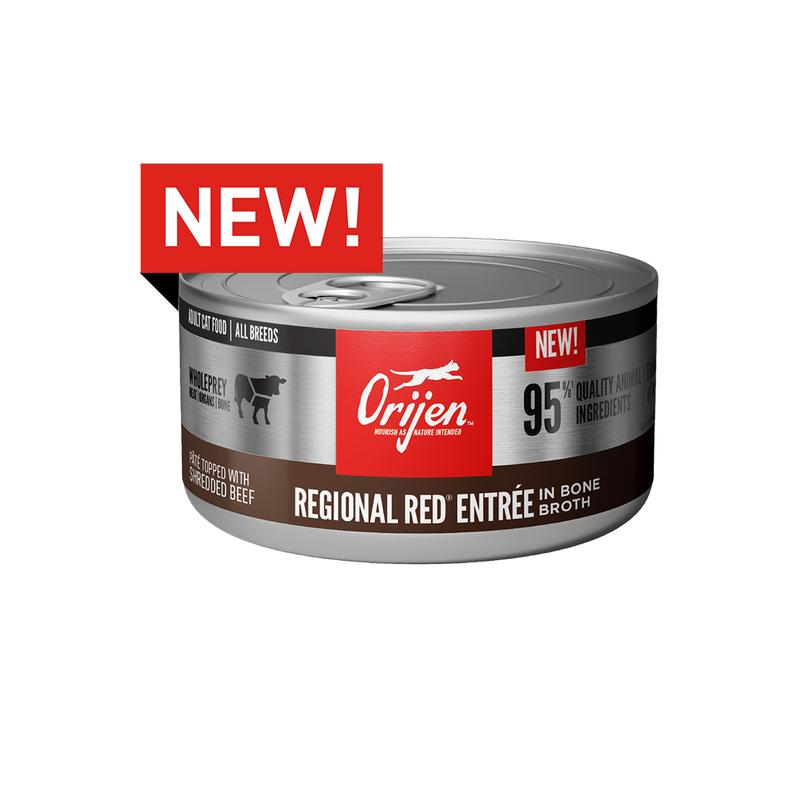 NEW ORIJEN® Wet Cat Food is a super premium pâté packed with WholePrey animal ingredients. ORIJEN® Regional Red Entrée includes raw WholePrey ingredients like meat, organs and bone that provide the protein, nutrients and minerals your cat needs to be their best. At least the first 5 ingredients in every ORIJEN diet are fresh or raw animal ingredients, and the first 10 ingredients in this wet cat food diet are fresh or raw lamb, beef, poultry and fish ingredients. Packed with 95%1 animal ingredients and no peas, lentils, legumes, carrageenan or gums, ORIJEN Wet Cat Food provides the nourishment your cat needs to thrive.