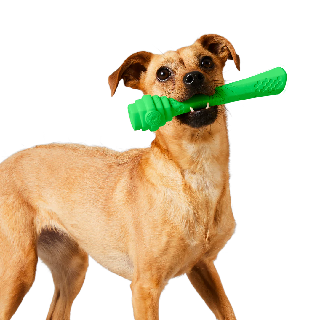 Made in the USA, the Hive Fetch Stick is bouncy, durable, and super engaging! Dogs love to gnaw on the hive shape, which promotes healthy teeth and gums. They can easily carry it in their mouths without the risks of a natural stick, which can hurt your pup’s mouth and digestive system. The Hive Fetch Stick’s bright color is easy for you and your dog to spot indoors, on land, or floating in water.