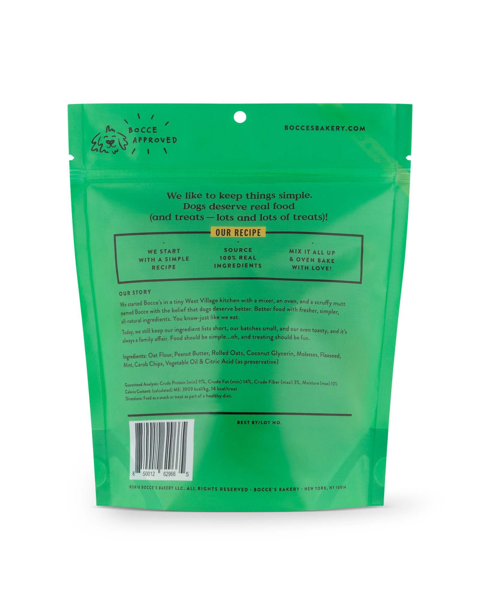 Oat Flour, Peanut Butter, Rolled Oats, Coconut Glycerin, Molasses, Flaxseed, Mint, Carob Chips, Vegetable Oil, & Citric Acid