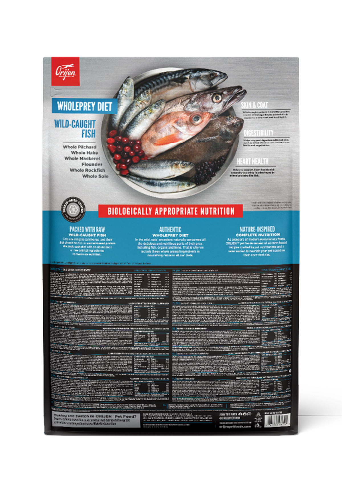 Help your cat thrive with the power of protein-rich recipes that provide peak nourishment. As obligate carnivores, modern cats are built like their ancestors and thrive on a Biologically Appropriate diet rich in protein and fat sourced from a variety of animal ingredients. ORIJEN® Six Fish diet is made with fish from raw1 wild-caught pilchard, hake, mackerel, flounder, rockfish and sole. Packed with WholePrey animal ingredients like fish, organs and bone, ORIJEN Six Fish diet is made with the most nutrient-dense, succulent parts of the prey to deliver the nutrition cats need. With 85%2 quality animal ingredients and a freeze-dried liver coating, this diet is beyond comparison.