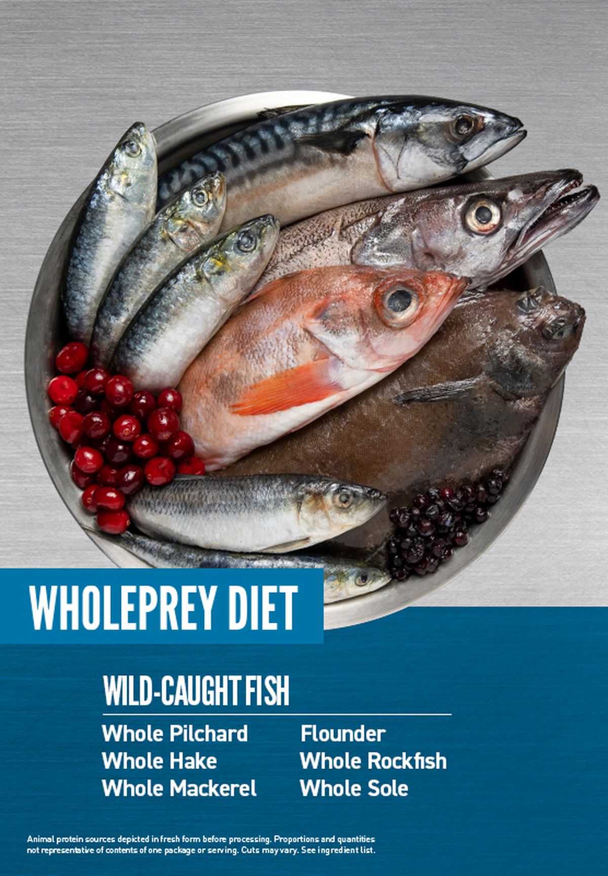 • Our authentic WholePrey diet features the most succulent parts of the prey like fish, organs and bone to mimic what your cat’s ancestors consumed in the wild.