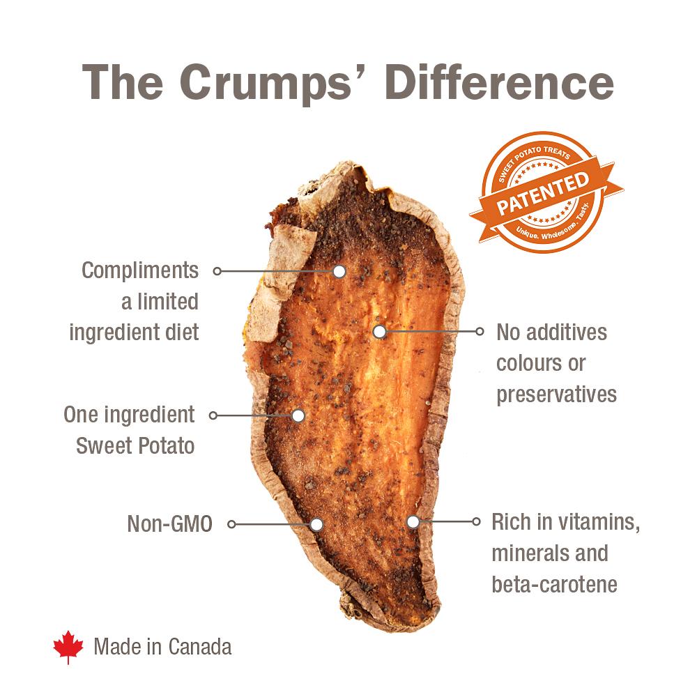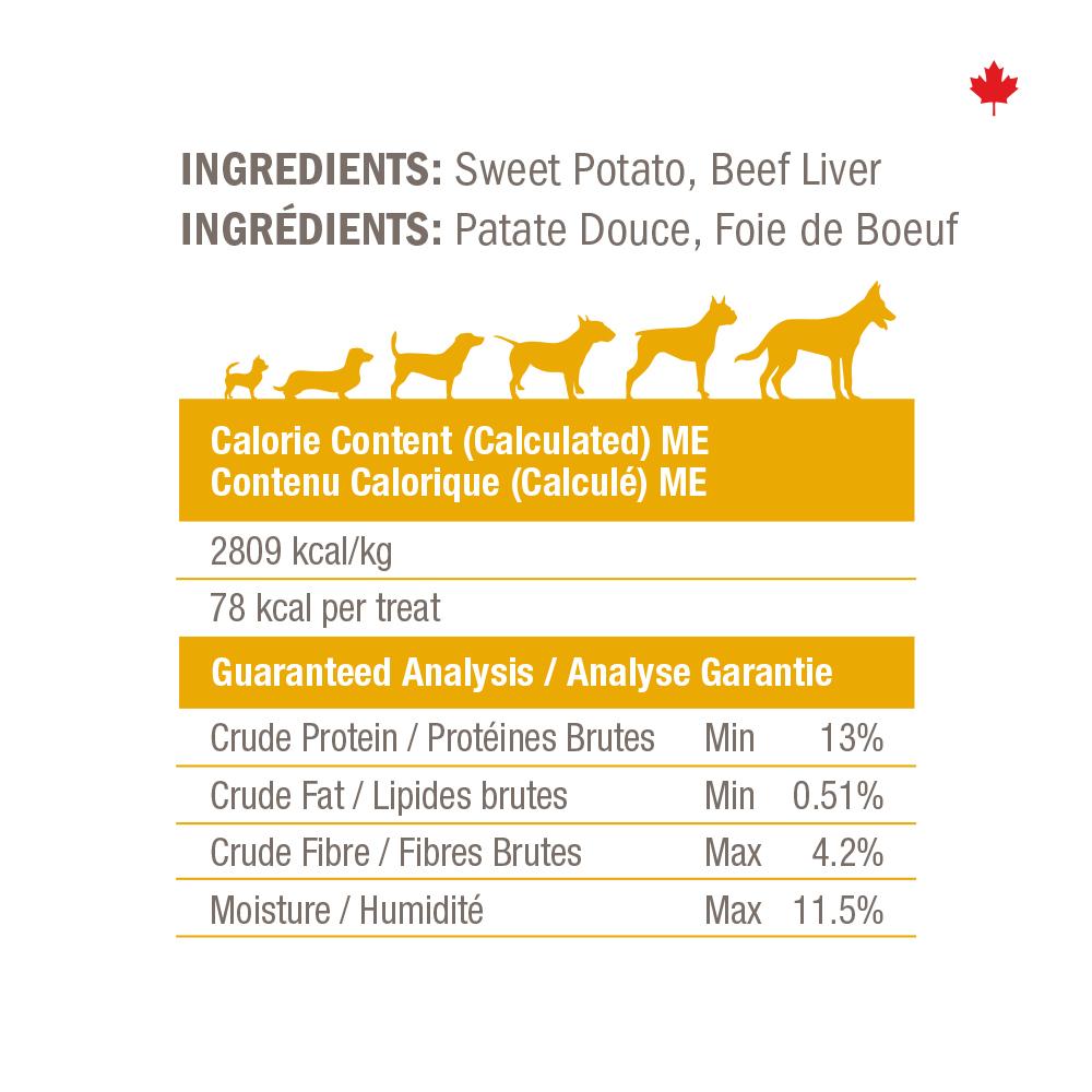 One of our most popular treats, we slice fresh North American grown sweet potatoes and slow bake them. In addition to their terrific flavour, these vegan dog treats have the added benefit of being rich in vitamins, minerals, and beta-carotene. A great option for dogs with allergies or food sensitivities. Made with just one ingredient.