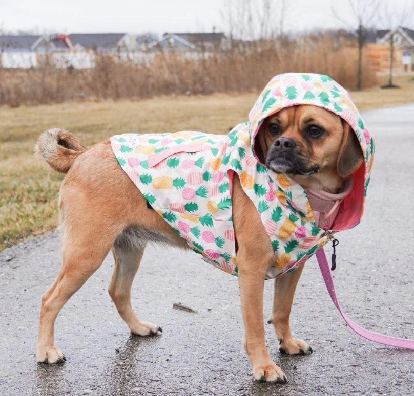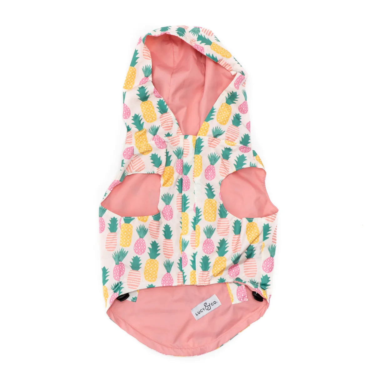 Flip it and reverse it. A classic raincoat to take on the rain. This pineapple reversible rain jacket for your dog is lightweight and ready to brave the elements. We had the on-the-go dog in mind when we designed these: watertight zip closures and a leash clasp opening on the backside of the coat to get out the door and dance in the rain.