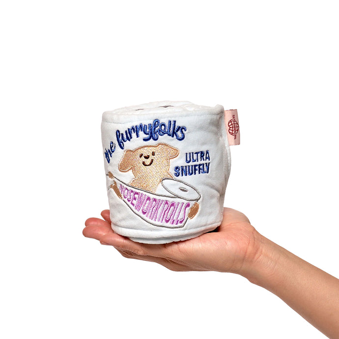 The toilet paper Nosework toy is designed for dogs to use their sense of smell to find tasty treats, providing a play culture that reduces stress and promotes healthy play.
