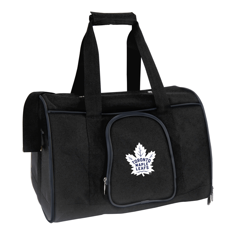 The Toronto Maple Leafs Pet Carrier Premium 16" bag in Navy is a stylish, convenient and safe way to travel with your pet. Made of lightweight polyester this Pet Carrier fits comfortably under most airline seats while affording your pet ample, non-compacted space. Plastic mesh panels on three sides provide excellent ventilation and pet visibility. Has a removable washable fleece floor panel for comfort and structural stability. Carrier is easy to lift and carry, with a sturdy padded top handle, adjustable/detachable shoulder strap, and a side sleeve that enables the carrier to slide onto the handle of your roller suitcase. for easy transport within the airport. Also includes a side zipper pocket for small items and can accommodation pets up to 16lbs.