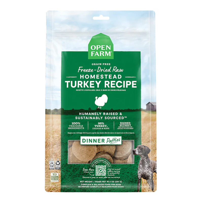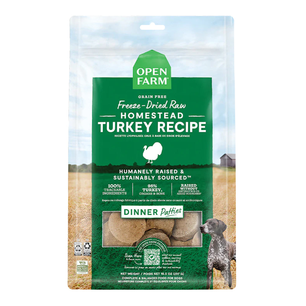 The most convenient way to feed your dog a real raw diet, this single animal protein recipe provides a delicious complete and balanced meal. Our Homestead Turkey recipe contains 95% free-to-roam turkey, nutrient-rich turkey necks and turkey livers and calcium rich ground bone. Open Farm turkey patties are a true prey-model diet your dog won’t be able to resist!