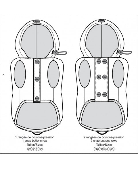 • Single row of snap buttons from size 26 to 32 / double row from size 35 to 45