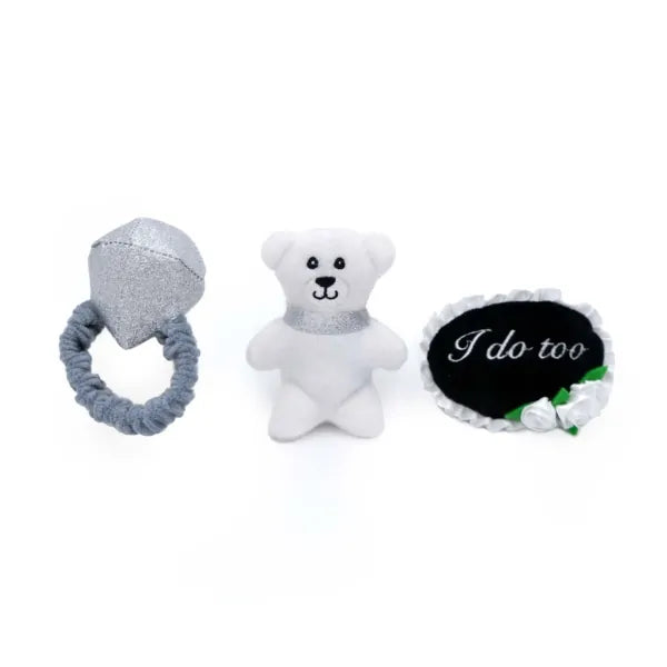 The perfect gift for the pup who is saying "I do too," it’s the Zippy Burrow® Wedding Ring Box! Just stuff the trio of wedding themed Miniz into the box and sit back and watch as your dog works to snag them all. Once your pup has all the squeaky little toys out, they’ll be begging you to put them back in again and again for hours of fun!